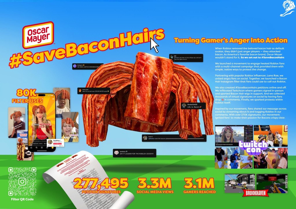 Idea: Oscar Mayer seized the moment to join the conversation, leveraging its connection to bacon and its playful brand purpose of sparking smiles. We launched #SaveBaconHairs, a digital campaign rallying fans to challenge Roblox’s decision. By collecting petition signatures through bacon emojis and engaging fans on social, in-game, and at TwitchCon, we turned their passion into action.