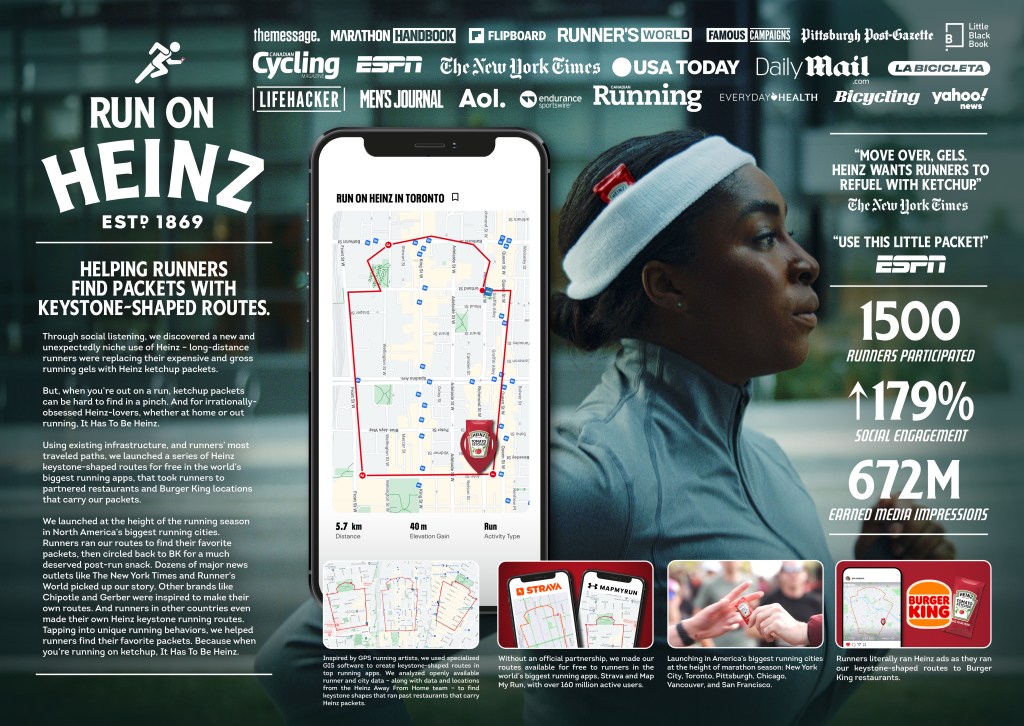 Idea: Our target was runners using our packets and the broader running community. To engage them directly, we tapped into their favorite running apps and the global trend of GPS art. Using the apps’ built-in functionality, we designed keystone-shaped routes guiding runners to our packet locations. Heinz created keystone-shaped routes in six major North American cities: New York City, Vancouver, Toronto, Pittsburgh, Chicago, and San Francisco. Using GIS mapping software, the routes utilized existing infrastructure and highlighted Heinz-partnered restaurants where runners could grab free ketchup packets. The maps were accessible for free on Strava and MapMyRun, the world’s largest running apps with over 160 million users.