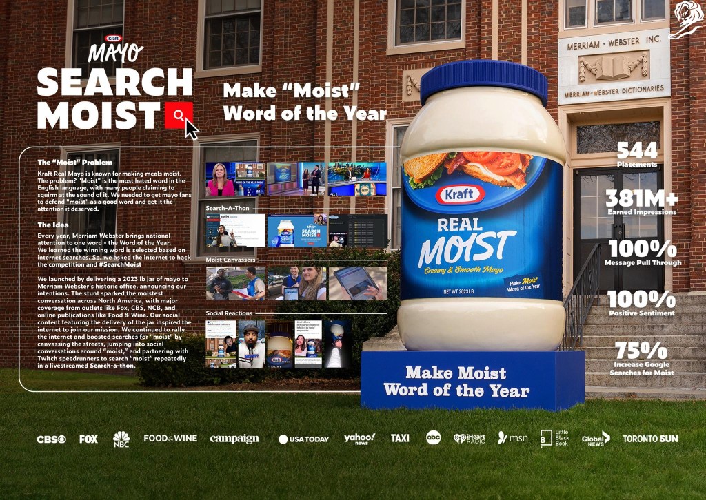 Results: Kraft’s campaign to redeem the word “moist” gained widespread internet and media support, driving a 75% increase in Google searches and over 21K visitors to Merriam-Webster’s website. Though “moist” didn’t win Word of the Year, fans rallied with slogans like “Justice 4 Moist” and “Moist 2024,” signalling a shift in public perception. With 544 media placements, 381 million impressions, and coverage from outlets like FOX, CBS, NBC, and Food & Wine, the campaign made a splash, most notably with the mysterious disappearance of an 8-foot Kraft Mayo jar from Merriam-Webster’s office, leaving only tire tracks behind.